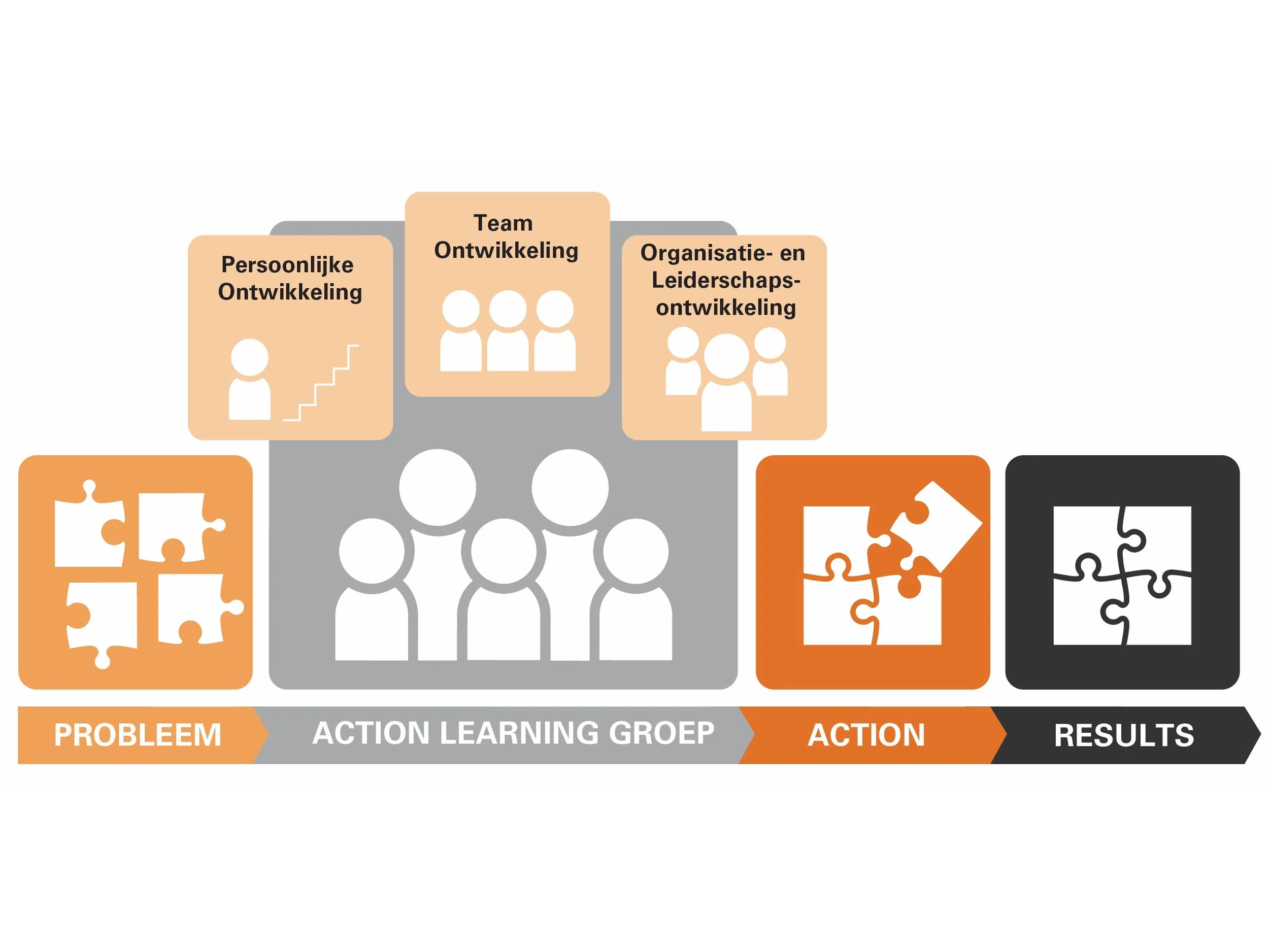 Het bovenstaande beeld laat de verschillende aspecten van Action Learning zien. Het startpunt is een actueel probleem, waarover een daarvoor geformeerde Action Learning Groep elkaar bevraagd. Nadat er overeenstemming is bereikt over de grondoorzaken van het probleem, gaat deze groep concrete oplossingen (Actions) formuleren. Nadat deze SMART zijn gemaakt en tot uitvoering zijn gekomen, gaat dezelfde groep (na verloop van tijd) reflecteren op de resultaten.